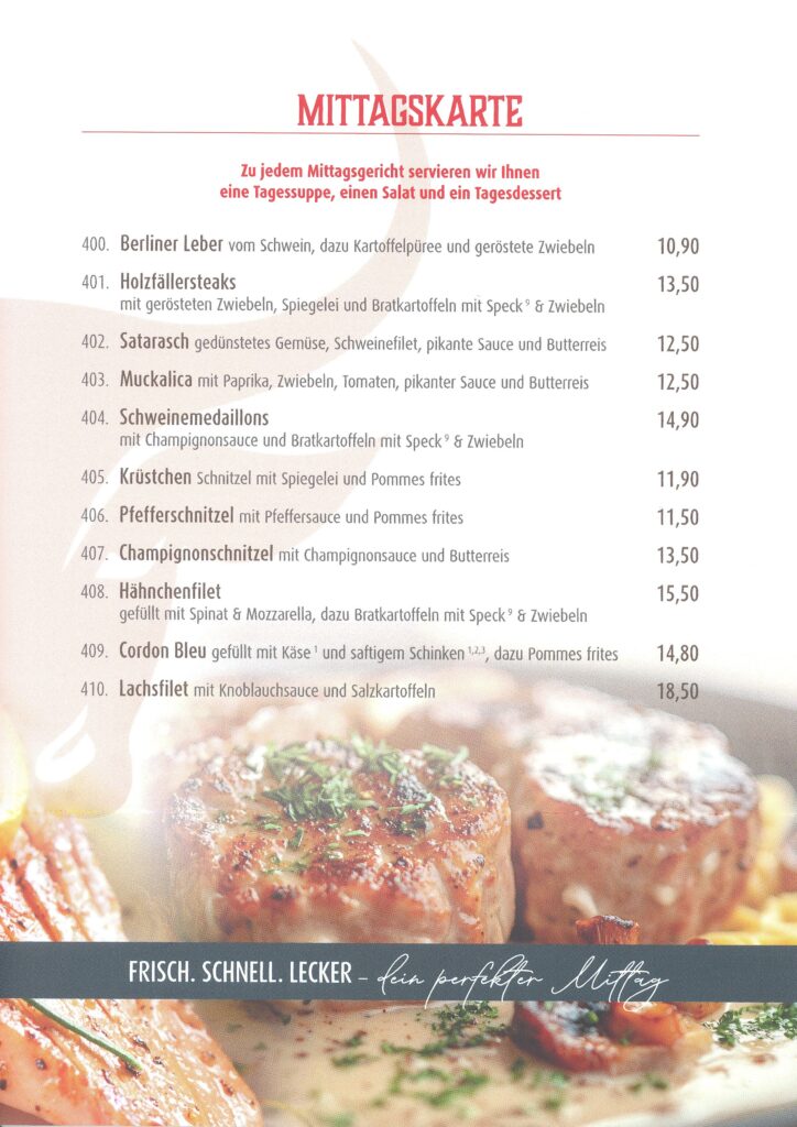 Für interessierte NEUE(!) Gäste zeigen wir an dieser Stelle die Mittagskarte auch sonntags, damit sich diese NEUEN Gäste auch sonntags ein Bild davon machen können, welche herzhaften und gleichzeitig preiswerten Gerichte sie wochentags und/oder auch samstags bei uns speisen und geniessen könnten. Wir hoffen, es läuft Ihnen bereits das Wasser im Mund zusammen. Unsere Stammgäste kennen das Gefühl ja bereits…